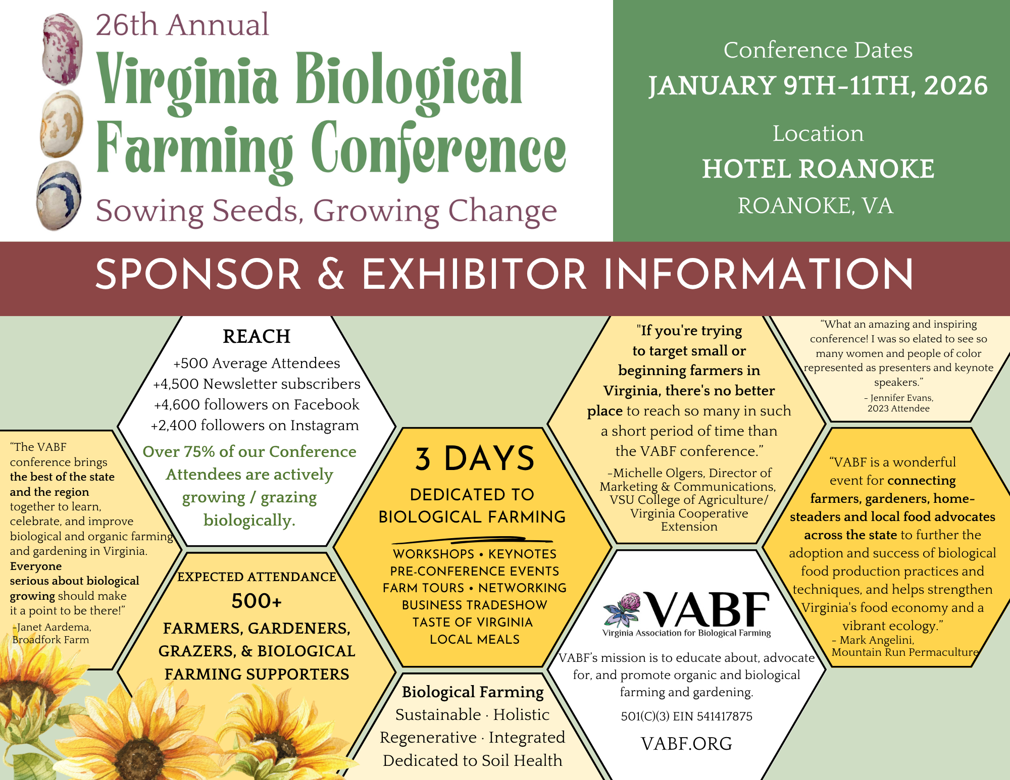 Several sponsor packages include conference registrations which can be designated to any individual of your choice or donated to a farmer in need of financial assistance. Scholarship Donations may also be added as an a la carte item. Registrant details will not be required at the time of payment. A member of the VABF team will follow up with each sponsor to provide registration instructions. All registrations must be completed by January 1, 2026.